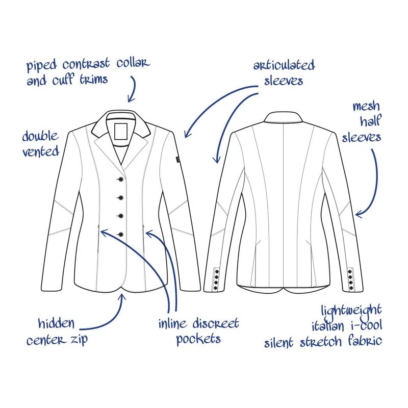Tailored using Tredstep’s exclusive high performance light weight i-cool fabric with silent motion and 360 degree stretch. The Solo Vision is the epitome of high performance in a show coat, incorporating mesh under sleeves, articulated arms, a hidden front zip with contrast color snap buttons and matching contrast collars and cuff details.